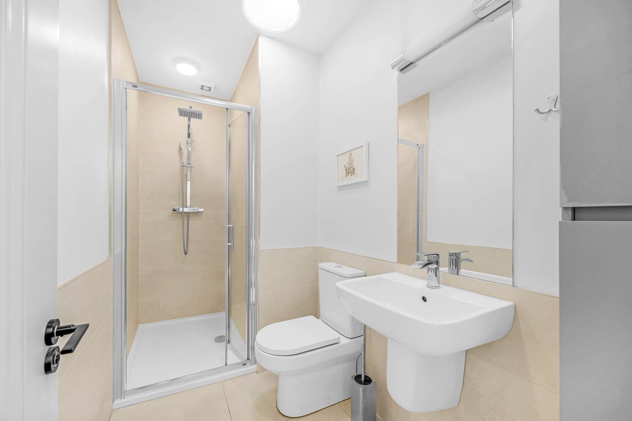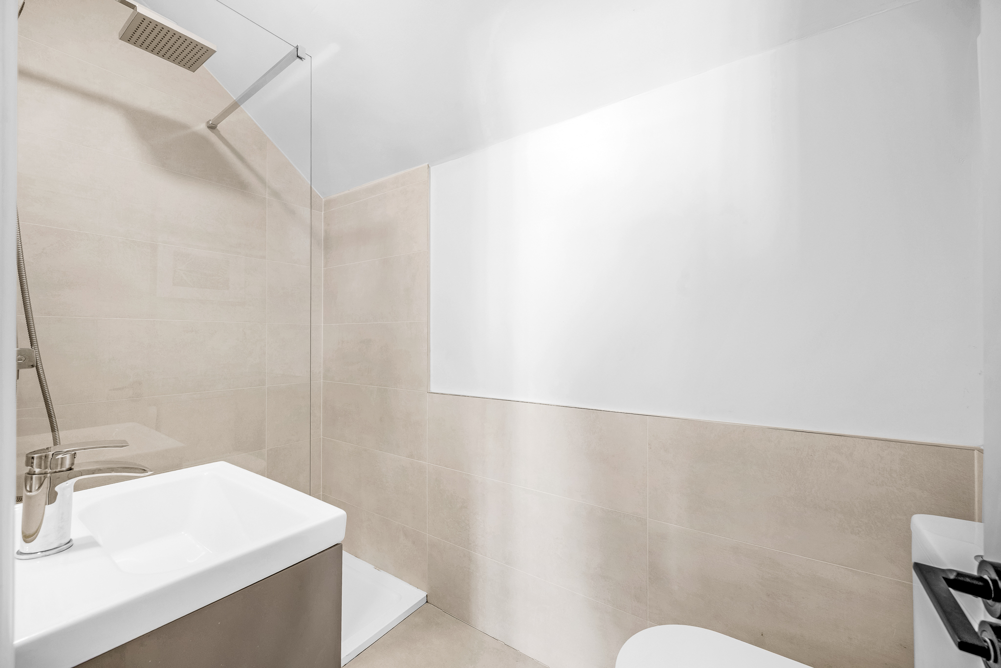 Sem-tiled en-suite with rainfall shower, W.C and W.H.B.