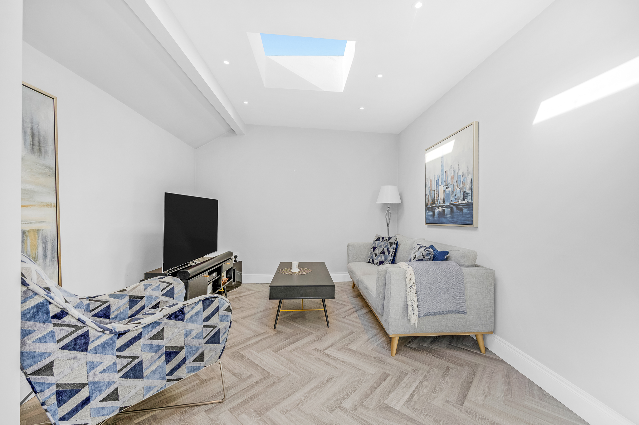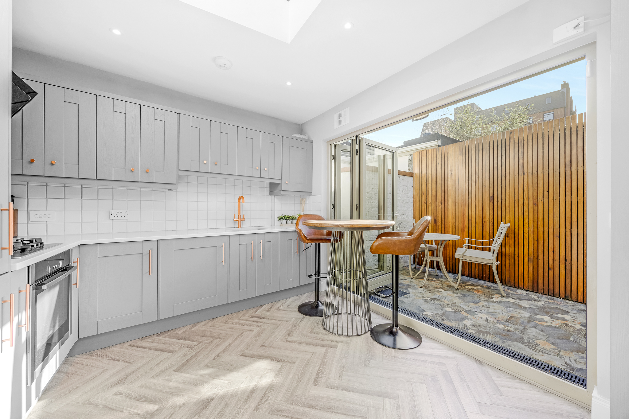 To the rear, a superb open-plan living space spans the full width of the house. The sleek contemporary kitchen flows seamlessly into the dining and living area, opening through sliding concertina doors onto a private south-facing patio garden — a sun-filled retreat ideal for outdoor dining and entertaining. Three skylights above flood the living space with natural light, creating a warm and inviting atmosphere throughout the day.