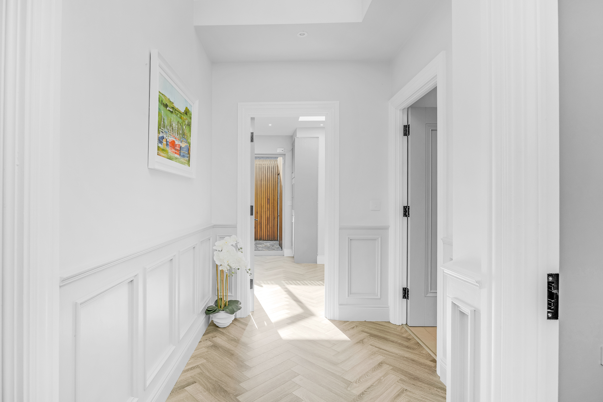 Inviting and bright entrance hallway with sky light and alarm system.