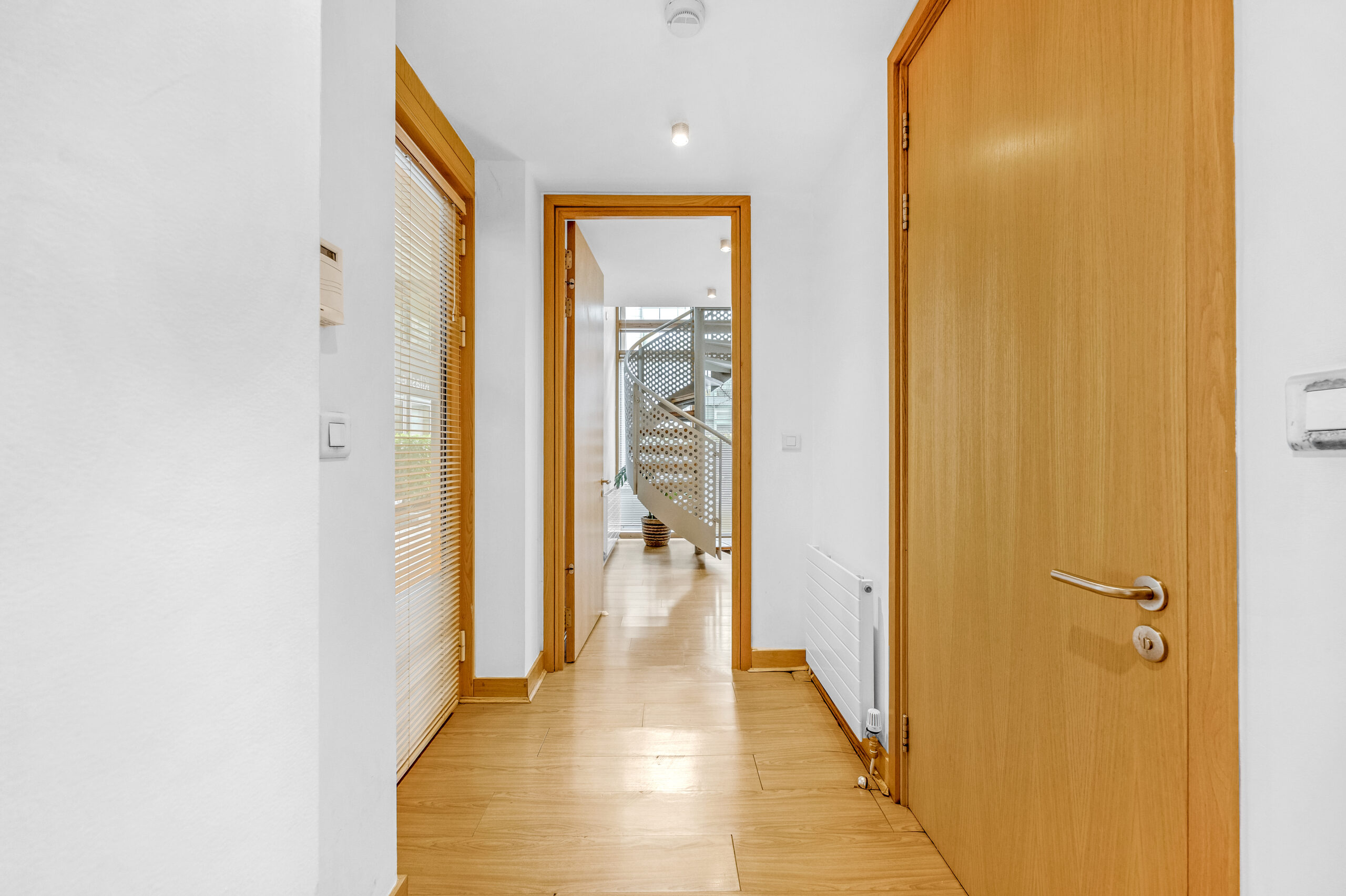 Inviting entrance hallway with timber flooring, bathroom and intercom.