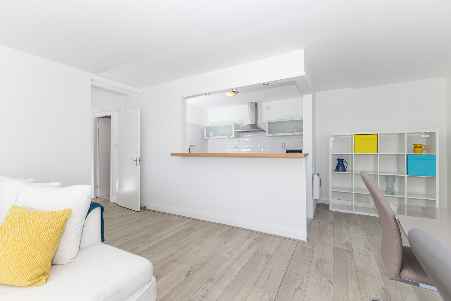 Inviting L-shaped entrance hallway with timber flooring, giving access to the hot press with storage.