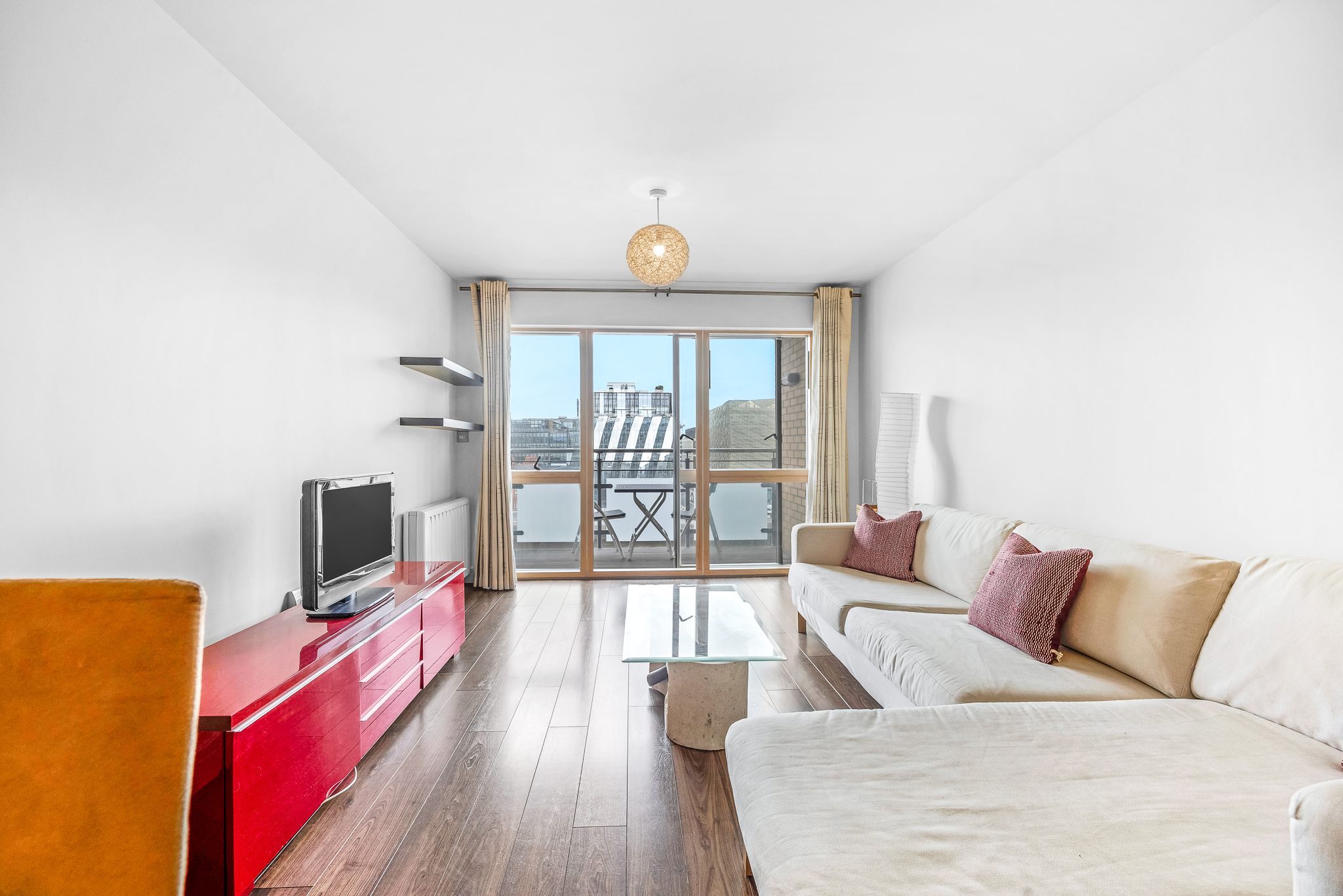 Light-filled living/dining area with timber flooring, floor-to-ceiling glazing and access to the terrace which overlooks the River Liffey.