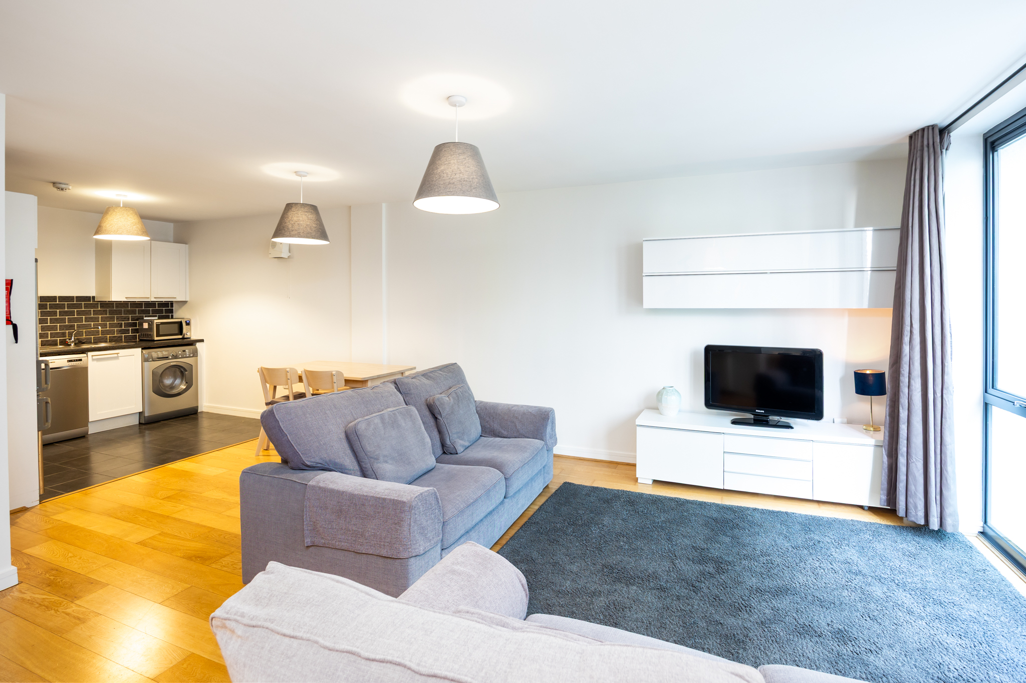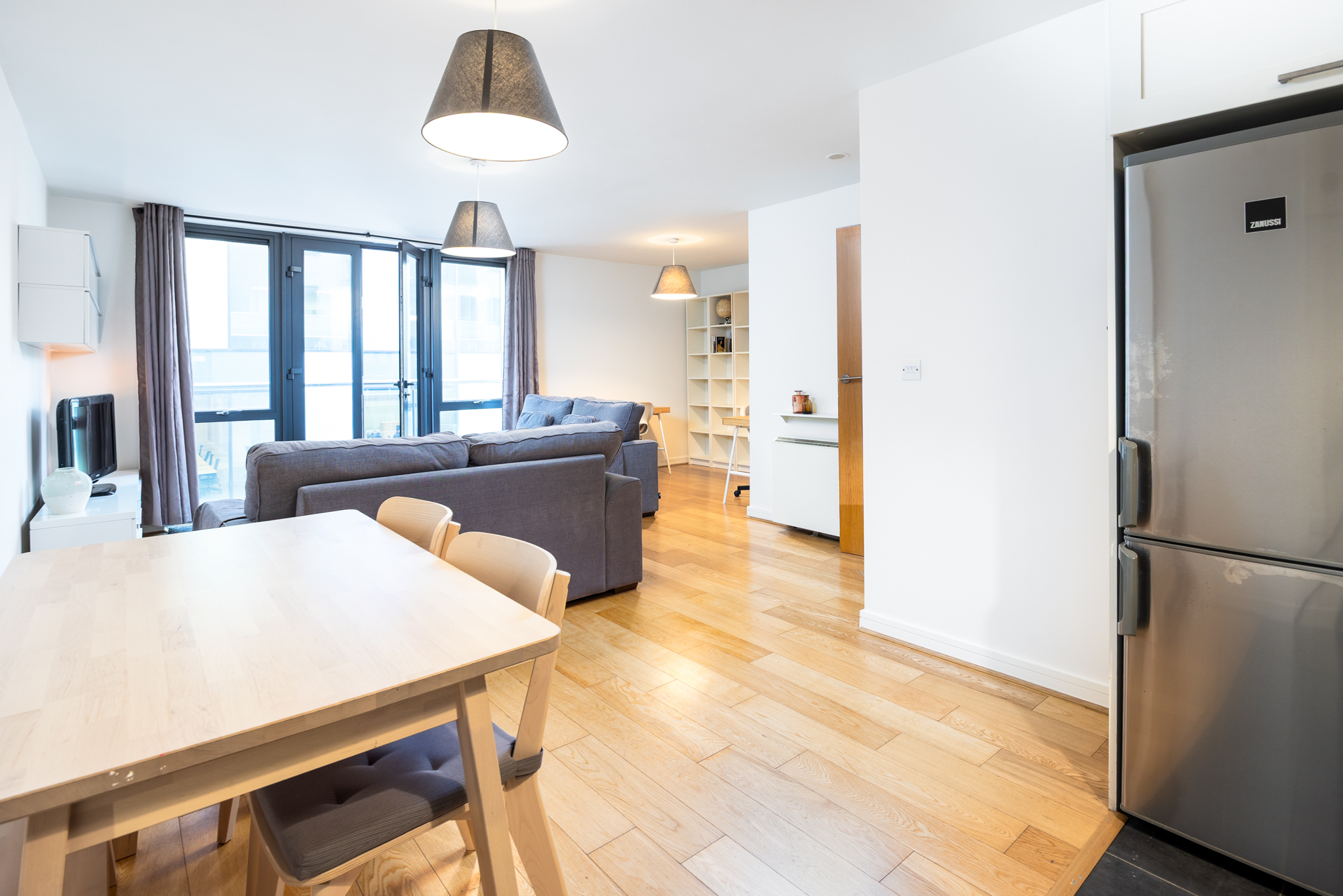 Spacious open plan area with floor to ceiling glazing leading to an East facing Juliette balcony with views towards the River Liffey and Grand Canal Dock. Fully equipped kitchen with dishwasher, fridge/freezer, oven, hob and extractor fan. Tiled flooring and backsplash.