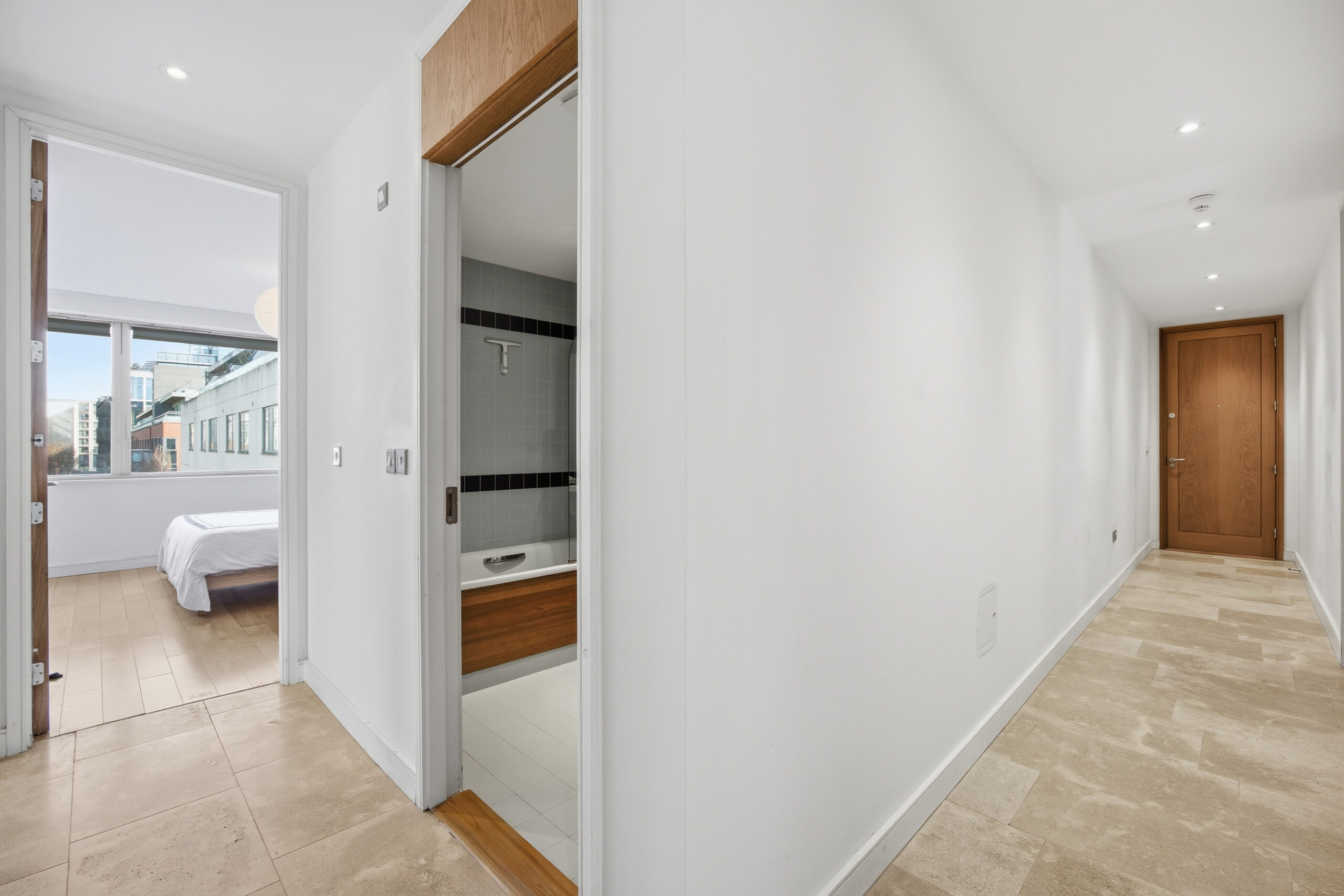 Spacious entrance hallway with Italian limestone flooring, spot lighting, intercom and access to all principal rooms.