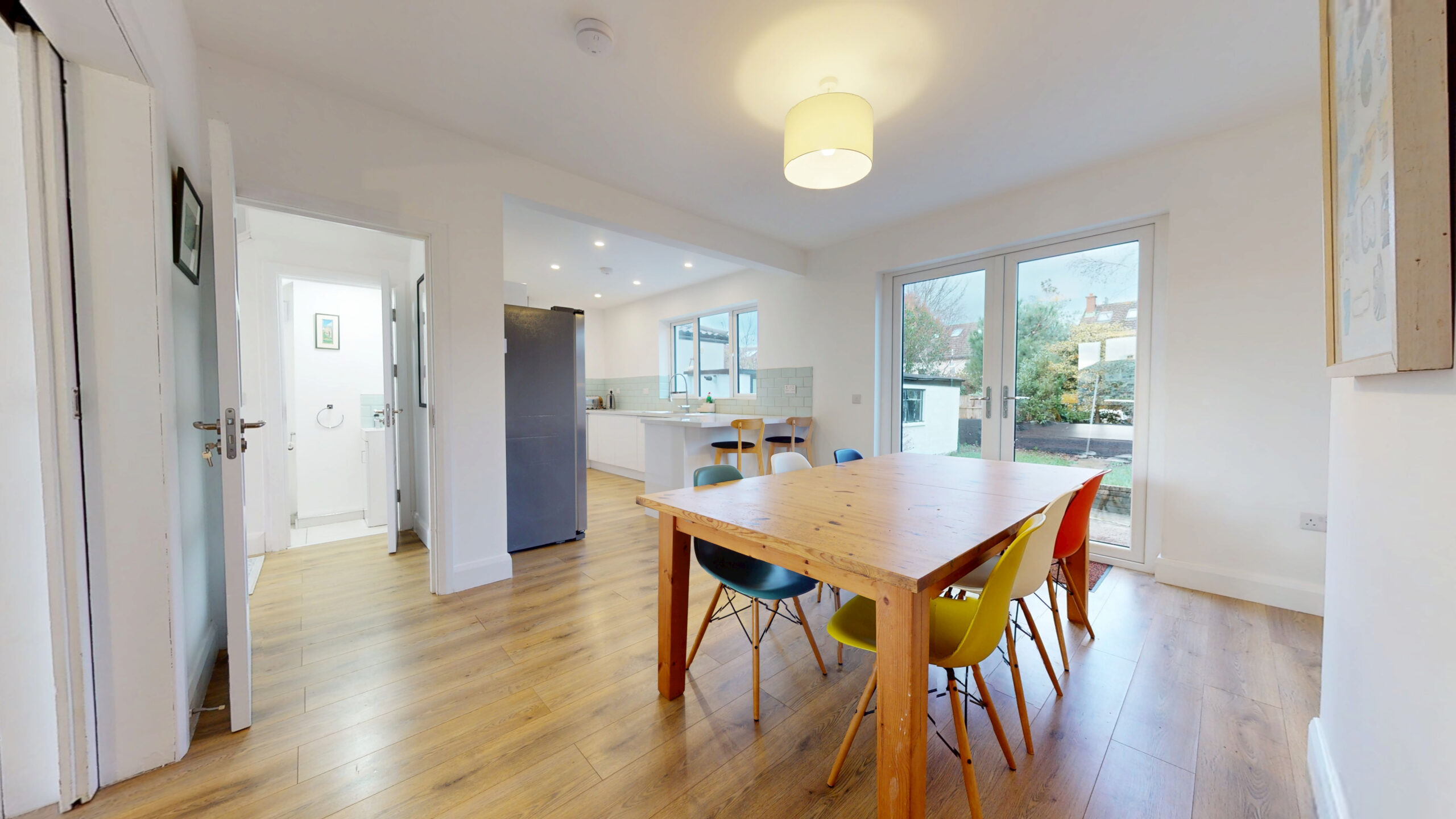 The ground floor comprises bright entrance hall with a guest WC, living room with large windows and sliding doors leading to an open plan dining room and fully equipped kitchen. Double French doors open to a large east facing patio and low maintenance garden. On the first floor there are two double bedrooms, two single bedrooms and a main bathroom.